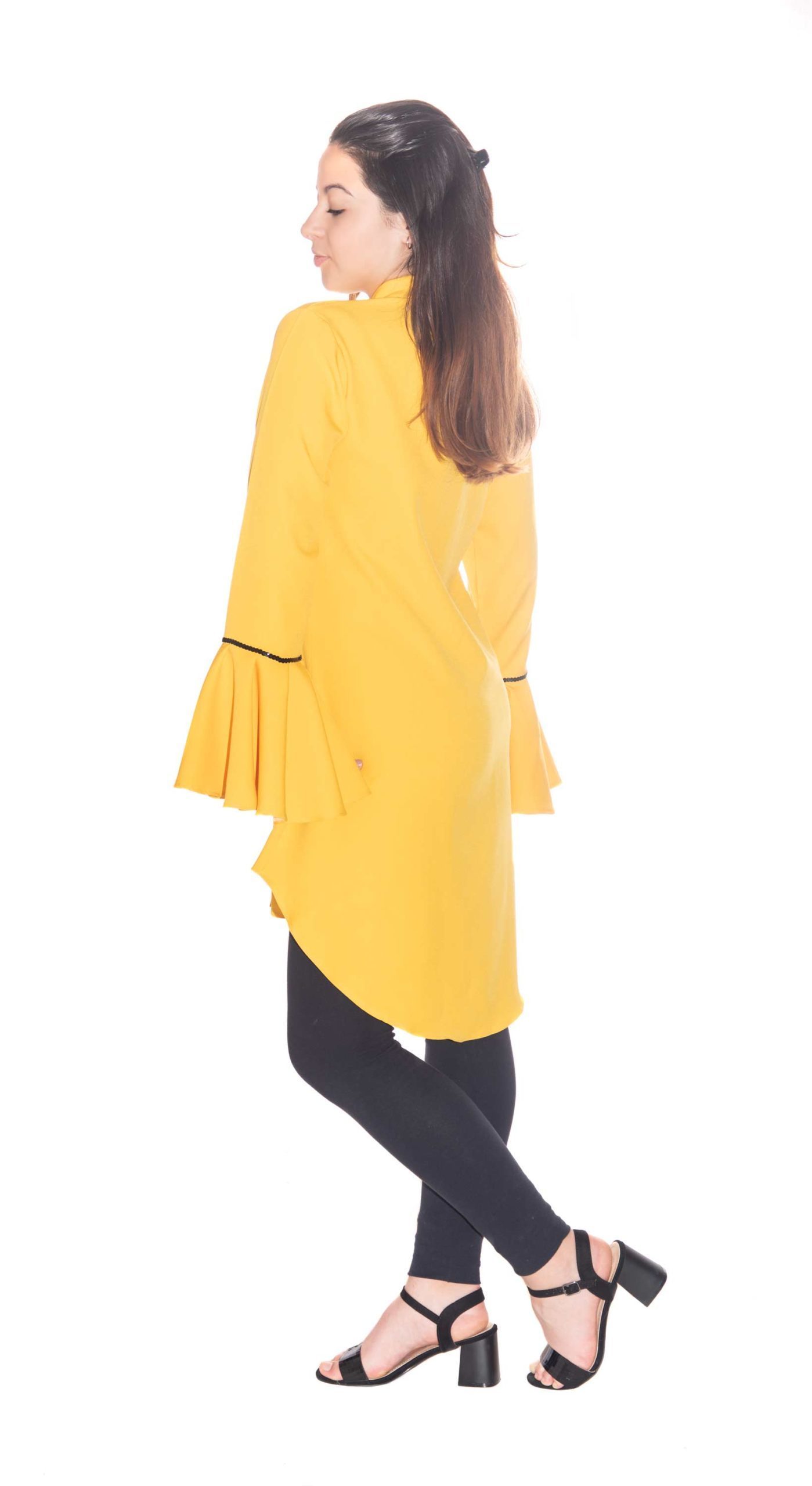 Асиметрична кройка, клоширан ръкав и малко яка столче.